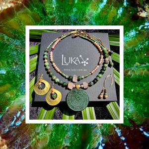 This one-of-a-kind statement set is made from the following semi-precious stones and findings: