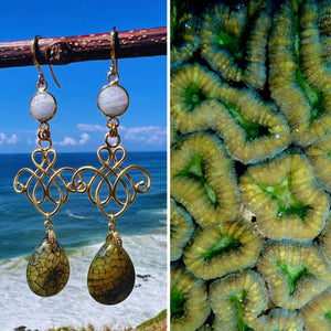 Suspended beneath, the dragon vein agate from Brazil mirrors the mottled translucence of coral flesh stretched over skeleton, its vein-like inclusions recalling the fine networks that sustain the animal. At the crest, small moonstone briolettes shimmer with the same shifting iridescence I see when sunlight refracts across living coral tissue.