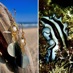 The earrings are crafted as Intarsia (by a stone artisan), a meticulous fusion of onyx, hematite, and mother-of-pearl. The vertical inlay is deliberate: black onyx and silvery hematite running like the worm’s bands, with mother-of-pearl bringing that soft marine luminescence I saw underwater. Above the discs, I placed a single pearl for organic balance and a tiny onyx bead, the details held in a 22k gold-plated frame that offers warmth against the crisp monochrome.