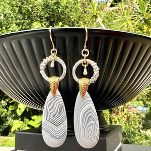 Not all stones are created equal, and these teardrop Agates with otherworldly banding are my point in case. Like trapeze artists, they are suspended by a tiny silver-plated rings, complemented by tiny pearls and set into a 22k gold-plated base (6.7cm). Timeless simplicity with a bang!