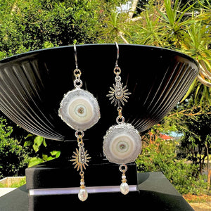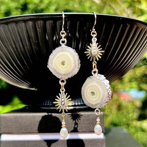 These unusual earrings are made from stalactites that feature a cream white core and a frosty white crystal outer ring with a that was sliced crosswise and the flat surfaces were highly polished. Together with tiny moonstones & pearls and set into a 22k gold & silver-plated base, these earrings are a little bit special (7.9cm long).