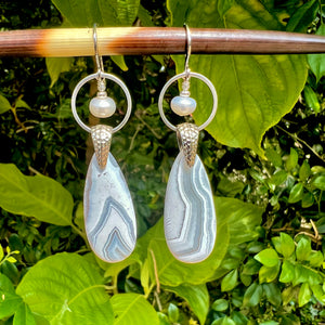 Not all stones are created equal, and these teardrop Agates with otherworldly banding, are my point in case. Like trapeze artists, they are suspended by a tiny silver-plated rings, complemented by tiny pearls (6.4cm). Timeless simplicity with a bang!