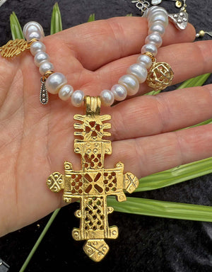 Unlike crosses in western Christianity, the artisans of Ethiopia are being allowed the freedom to exercise a measure of individual taste and creativity in their choice of shape and patterns. I love that... and so I mixed this 24k gold- plated cross with smooth white pearls  &  22k gold & silver-plated charms!