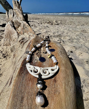 This  cultural melting pot  is a little more glamorous - with Rhinestones & Pyrite (Hong Kong) thrown into the mix! The Pearls were grown by Chinese pearl farmers, gold- and silver charms cast in a tiny workshop near Istanbul and Seoul. The carved bone pendant I bought from an Indian woman in Ubud who has married a New Zealander, and of course the set is designed and strung by a German - Australian with Polish & Serbian heritage .