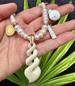 The  carved bone pendant I bought from an Indian woman in Ubud who has married a New Zealander, and of course the set is designed and strung by a German - Australian with Polish & Serbian heritage .