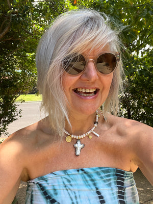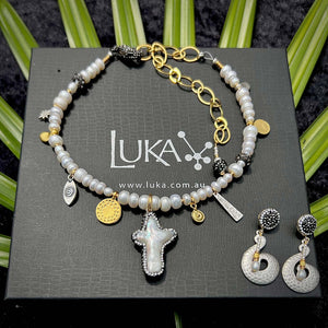 But this isn't where the story ends, the cross then got embellished by micro-rhinestones... and finally ended up with other rhinestones, pearls and 22k-gold & silver charms in this necklace. Please do zoom in!