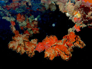 That dive was like swimming through a cathedral of sponge sculpture, with the underwater torch light shafting through the gaps and shoals of fish darting between. The colours under there were fierce—intense reds, burnt oranges, deep golds, and shadowy blacks.