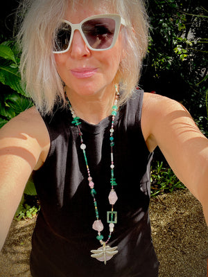 The rest of the necklace builds that feeling out through rose quartz, African Turquoise, Agates, Chrysocolla, Pearls  and irregular glass beads that reflect the scattered beauty of floating algae mats, glints of fish scale, and shifting currents.