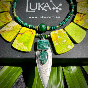 The necklace is anchored by a spear-like silver-plated pendant etched with tidal motifs, framed by inlaid mexican crazy lace agate and sea sediment jasper. Its shape recalls both spear points and planktivorous fish jaw structures—designed for precision and impact.