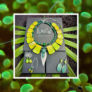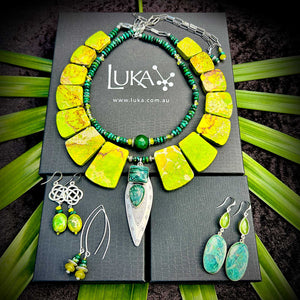 This one-of-a-kind statement set is made from the following semi-precious stones and findings:
