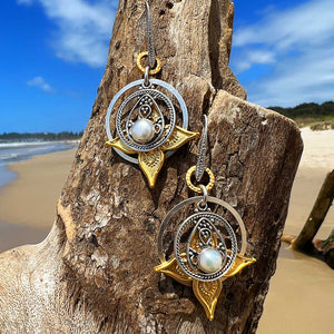 Nothing embodies summer more than white pearls, anchored to & set into and richly engraved gold-plated flower-like 22k gold-plated casts from Istanbul and completed by concentric silver circles.