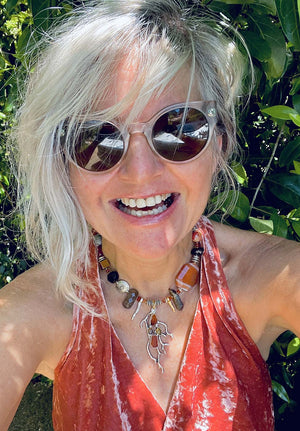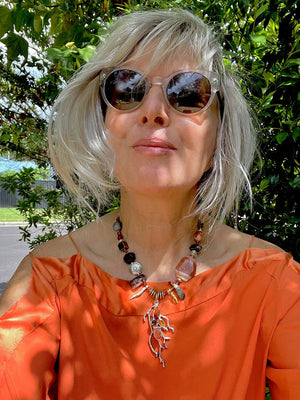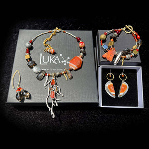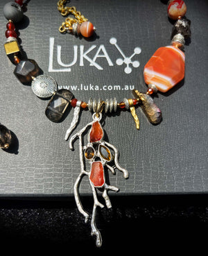 This set is delicious, in a Mars & Venus - warm gold- smoky Quartz - Carnelian - Agates- Jasper - Hematite sort of way! Yet there is enough silver in there (plated Druzy Agate) to counterbalance the warmth with cool. The focal point is a raw Carnelian & faceted Citrine pendant set onto a silver branch, a little whimsical and contemporary in equal parts.  Can you tell - I really love this set - which was inspired by a frosty morning sunrise at Uluru!