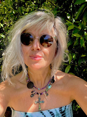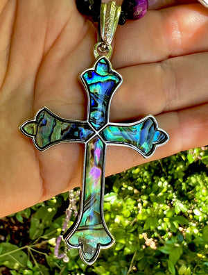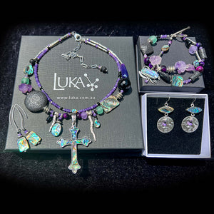 In this set I added enough purple Amethyst and Agates, and Balinese glass beads  to harmonise with the purple and green hues in the Paua, and juxtaposed it with just enough black Lava, Onyx and Agates to give it a calming background.