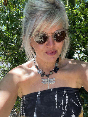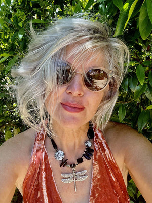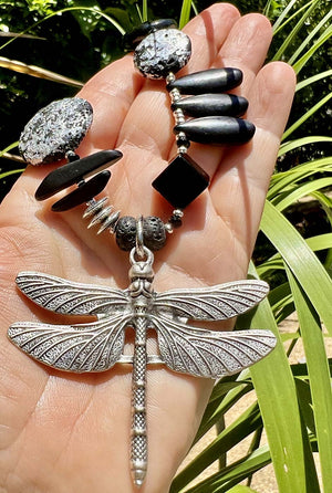 I so rarely get this excited about terrestrial critters- but these dragonflies from Istanbul have drawn me in big time! They look like they have just flown out of Lalique’s studio in Paris. I paired the dragonfly with every shape of black Onyx, Lava, Tourmaline & Agates semi-precious stones with lots of silver.
