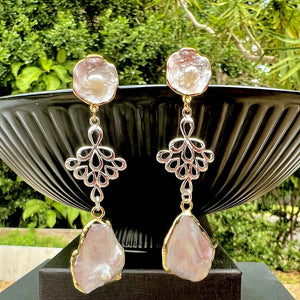 Bottom left:  On offer are contemporary pearl earrings - photographed in the intense Australian summer sun.  The pearls are organic studs in form of baroque round "pancake" pearls connected to silver lattice work and organic pearl drops to complete the perfect little trifecta. The pearls are set into a silver plated & 22k gold-plated base  are 6.7cm long and lightweight.