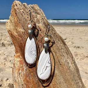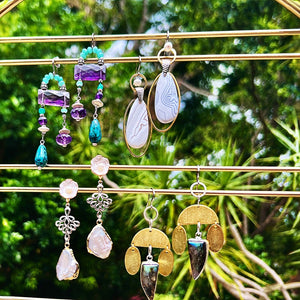 Top right: Not all stones are created equal, and these teardrop Agates with otherworldly banding are my point in case. Together with tiny button pearls they are set into a 22k gold & silver-plated base (6.5cm) Timeless simplicity with a bang!