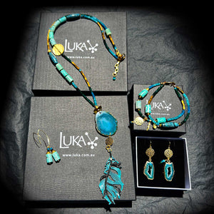 Living here in the Northern Rivers, this colour combination just flows in my veins. A rhinestone studded feather & Agate pendant are the definite focal point and so I kept everything else rather quiet.  Turquoise-blue mixed with seafoam greens -oceanic soft hues that just work together so well! Crazy Lace Agate, Amazonite, and tiny faceted Agates in an ombre pattern, Agate Geodes (in the earrings) and lots of of warm gold (22k gold-plated). The necklace is designed so you can wear it long or doubled up as a shortie.