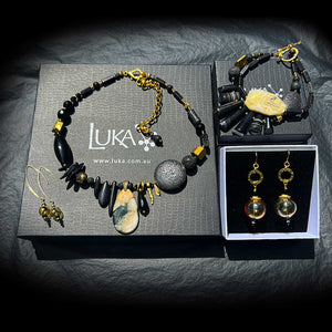 Every woman needs one black piece of jewellery in her wardrobe and if you enjoy a duochromatic mix of black with a warm yellow-grey dash and rich gold, this one's for you! This eclectic black marvel mixes organic Lava (some hand-gilded with gold leaf from Thailand), sleek Onyx and faceted Agates, gold-plated druzy Agate and Tourmaline and is anchored by the otherworldly black-yellow grey Oceanic Jasper pendant.