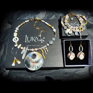 An organic silver Black Lip Pearl Oyster pendant, elegant pearls, tiny faceted Agates & Moonstone and raw Quartz Crystals all make love to each other.