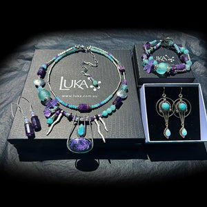 Since the Charoite always seems to hit such a raw nerve with you, so here is another piece, this time mixed with Larimar, Amethyst, tiny slices of raw Aquamarine, African handmade glass beads from Ghana and Brazilian Agates. Mixing Charoite from icy cold Siberia and Larimar from the warm ocean of the Dominican Republic is almost like bringing together the impossible- because both gemstones are only found in the above mentioned locations and would never co- occur!