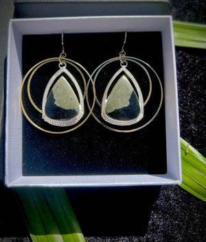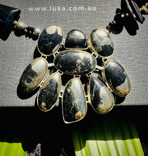 The centrepiece of this necklace is a Apache Gold cluster, a rare combination of Pyrite (Iron Sulfide) and Magnetite (Iron Oxide) found recently in the desert of Arizona. The colours are generally gold and sub-metallic black intertwined with occasional white trails. It's so hard to describe - but the bold flecks of metallic gold pyrite add a little glam to this jet-black gemstone.