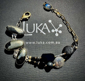 Mixed with mixed metal chains (22k gold & silver-plated), Onyx, Lava, Agates and tiny specks of Pyrite Rhinestones they feel very contemporary & sleek.