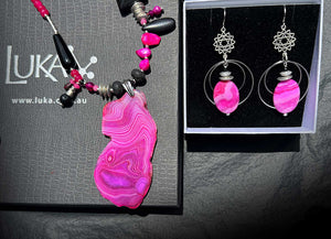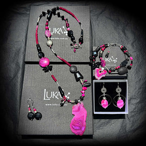 The flashes of pink from Crazy Lace Agate, Agate, Garnet & pearls are balanced by a lot of black Onyx, Lava & Agates and a set into a sleek silver-plated base.