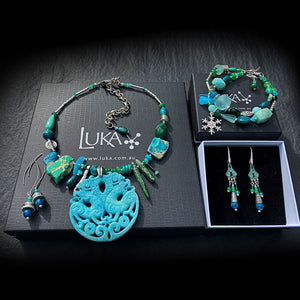 The oceanic colours of the Pacific Ocean in my village on a good day… a testament of a day spent in my “ocean office “. An exquisitely carved Jade pendant in company of Emerald, Chrysocolla, Chrysoprase, Agates, Sea Sediment Jasper, Amazonite, handmade recycled glass beads from Ghana and many more stones in the turquoise- bottle green spectrum.