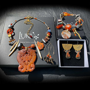 This set is delicious in a Mars & Venus - warm gold- smoky Quartz - Carnelian - Agates- Jasper- Mother-of-Pearl sort of way! Yet there is enough silver in there (plated Druzy Agate) to counterbalance the warmth with cool. Can you tell - I really love this set - which was inspired by a frosty morning sunrise at Uluru despite the carved Jade pendant which has chinese heritage!