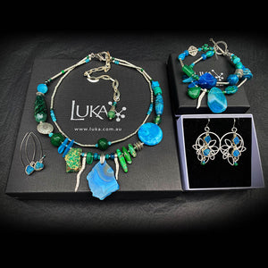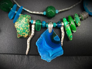 Sea Sediment Jasper, Apatite, Emerald, Agates, Howlite, Glass & Crazy Lace in all hues oceanic, have been combined with lots of cool silver-plated findings. It is a piece that perfectly picks up the mood on my beach (near Byron Bay) in which all the rich blue-greens of the ocean and the beach compete for your attention. It’s vivacious and it makes me feel like a day at the beach with salty skin and hair.