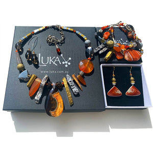 This set is delicious in Mars & Venus - warm gold- smoky Quartz - Carnelian - Agates- sort of way! Yet there is enough silver in there (plated Druzy Agate) to counterbalance the warmth with cool. Can you tell - I really love this s - which was inspired by a frosty morning sunrise at Uluru. The main earring stone is Noreena Jasper from Western Australia.