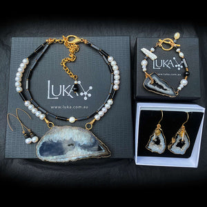 This eclectic marvel mixes Agate geodes with sleek Onyx and faceted Agates with the smoothest of Pearls. The golden aspects of these earrings subtly complement the starkness of black and white.