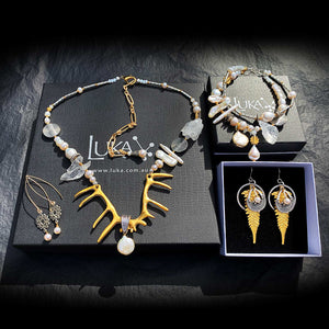 The eye is drawn to the antler-like 22k matte gold-plated pendant from Istanbul and the piece really comes alive through the many contrasting organic white forms.  As a nod to practicality this necklace has both gold- and silver plated beads and chains, so this piece can be accessorised with any other jewellery.