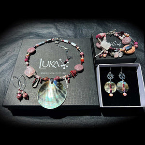 A silver-grey wavy Black lip oyster shell which I brought back from Vanuatu, paired with the ethereal hues of Rose Quartz and dark Merlot Garnet, Plum Pearls and rose-pink Mexican beads made from fossilised Feather Stars mixed with sleek silver-plated pieces to make the pieces fully balanced.