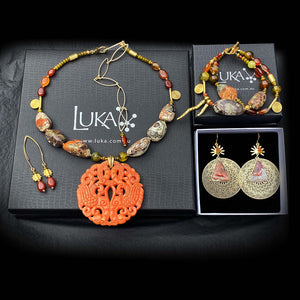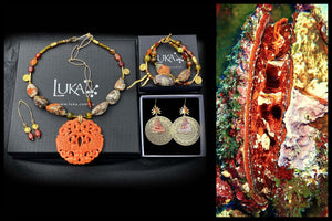 Ocean Jasper in the exact colours, Carnelians, Agates and of course the delicately  carved Jade pendant are my attempt to translate the Thorny Oyster into jewellery!