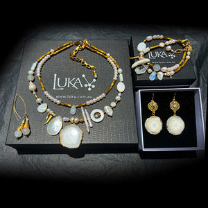 The monochromatic sensation that makes this “white on white” necklaces work so well is its timeless simplicity.  In ancient Greek, Quartz was called κρύος (kruos) meaning "icy cold" because some philosophers believed the mineral to be a form of supercooled ice – and that is exactly how it looks like!  In this necklace, the smoothest Agate Geode Pendant. Moonstone, sleek white pearls and mother of pearl are contrasted with raw hand-hammered Quartz crystals and are paired with ample gold a findings.
