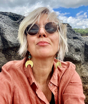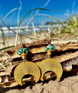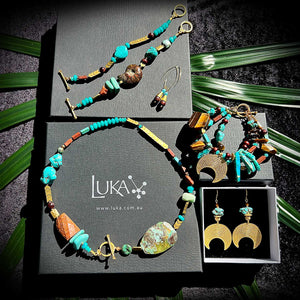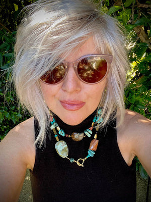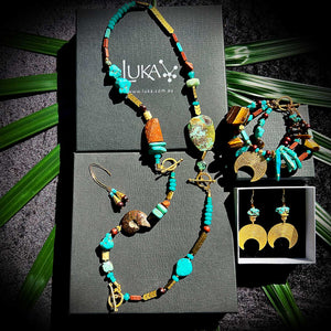 I used lots of Turqouse, Agate, ocean Jasper,  Sea Sediment Jasper, Tiger Eye & chocolate brown pearls in this oceanic piece, complimented with lots of rich 22k gold-plated pieces.  I also included an Ammonite from Morocco, which creates the perfect bridge from an oceanic creature that is now found as a fossil in the earth. Paying homage to life on earth well before us - some 250 million years old – this Ammonite is still showing off its beauty and intricacy in incredible detail.