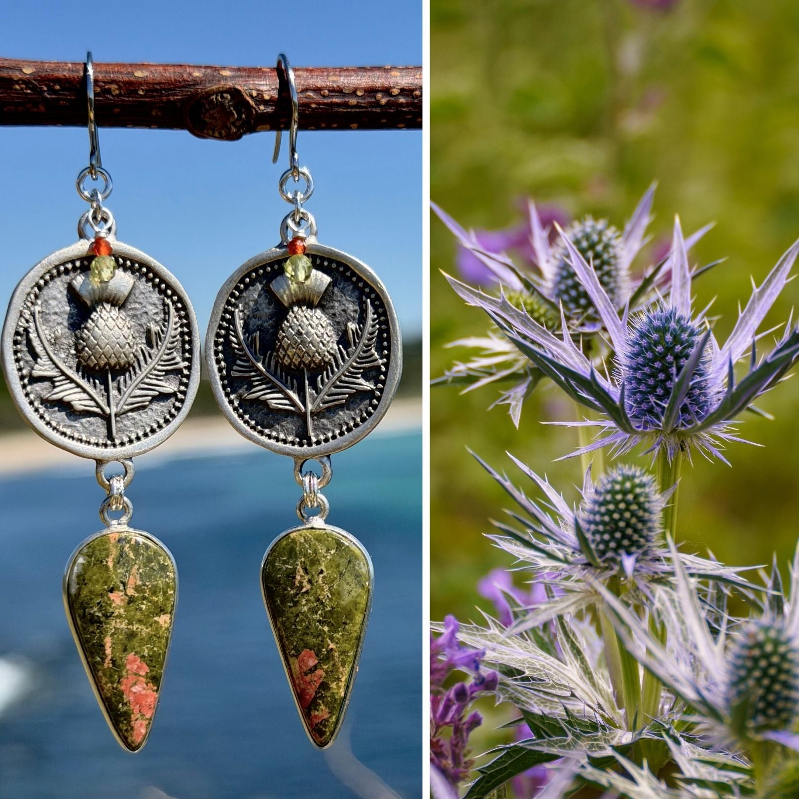 But walk the South Coast of New South Wales this spring, and you’ll see what I saw: hillsides buzzing with bees attracted to violet spikes that look almost electric in the sunlight. That was the spark for these 7.8 cm earrings — an ode to the humble thistle and to my great-grandmother Josefina, who revered them like saints.