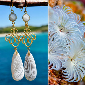 I wanted to translate that dialogue between fragility and form — to turn biology into architecture. The striped agate drops carry the worm’s concentric rhythm, soft yet exact. Round moonstones shimmer like distilled moonlight — cerebral, not sentimental. All framed in 22k gold-plated filigree crafted between Istanbul, Jaipur, and Seoul, echoing the worms’ skeletal elegance (9.2cm long).