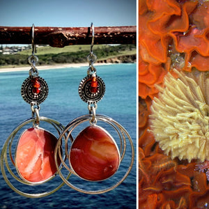 These earrings are my tribute to that flamboyant underwater congregation. Slices of Botswana agate shimmer in burnt orange, deep red, and soft champagne — a molten palette framed by concentric silver-plated rings that echo the hypnotic geometry of coral colonies. Tiny hessonite and Indian garnet add a flicker of warmth, while antique mandala tops lend a dash of rock’n’roll mysticism.