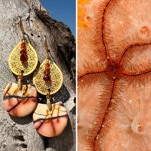 That encounter became these earrings: Mookaite discs paired with a gold filigree element echoing the sponge’s delicate lattice, finished with tiny Indian Hessonites and Carnelians glowing like reef embers.  They are 5.8cm short and set into a 22k gold -plated base from Istanbul & Seoul.