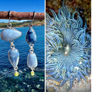 In designing these earrings, I translated that biological patterning into stone. The rare Owyhee Opals, with their clouded bands of blue and white, echo the layered folds of the anemone’s disc. Owyhee Opal,is only found in the Owyhee mountain range on the Oregon-Idaho border, and is noted for its sky-blue opaque color and calming energy.