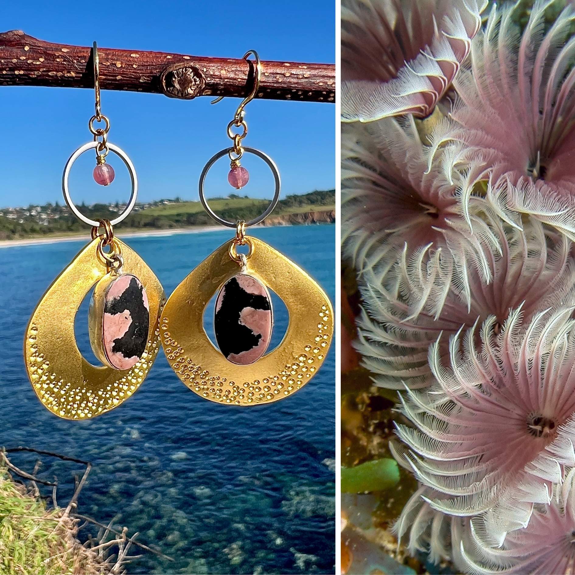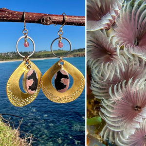 These earrings are an ode to the ocean’s quiet architects. The design began with a mesmerizing encounter with filter-feeding polychaetes, their feathery spirals blushing pink beneath the sea, impossibly delicate, like underwater cherry blossoms. Their form became the muse.