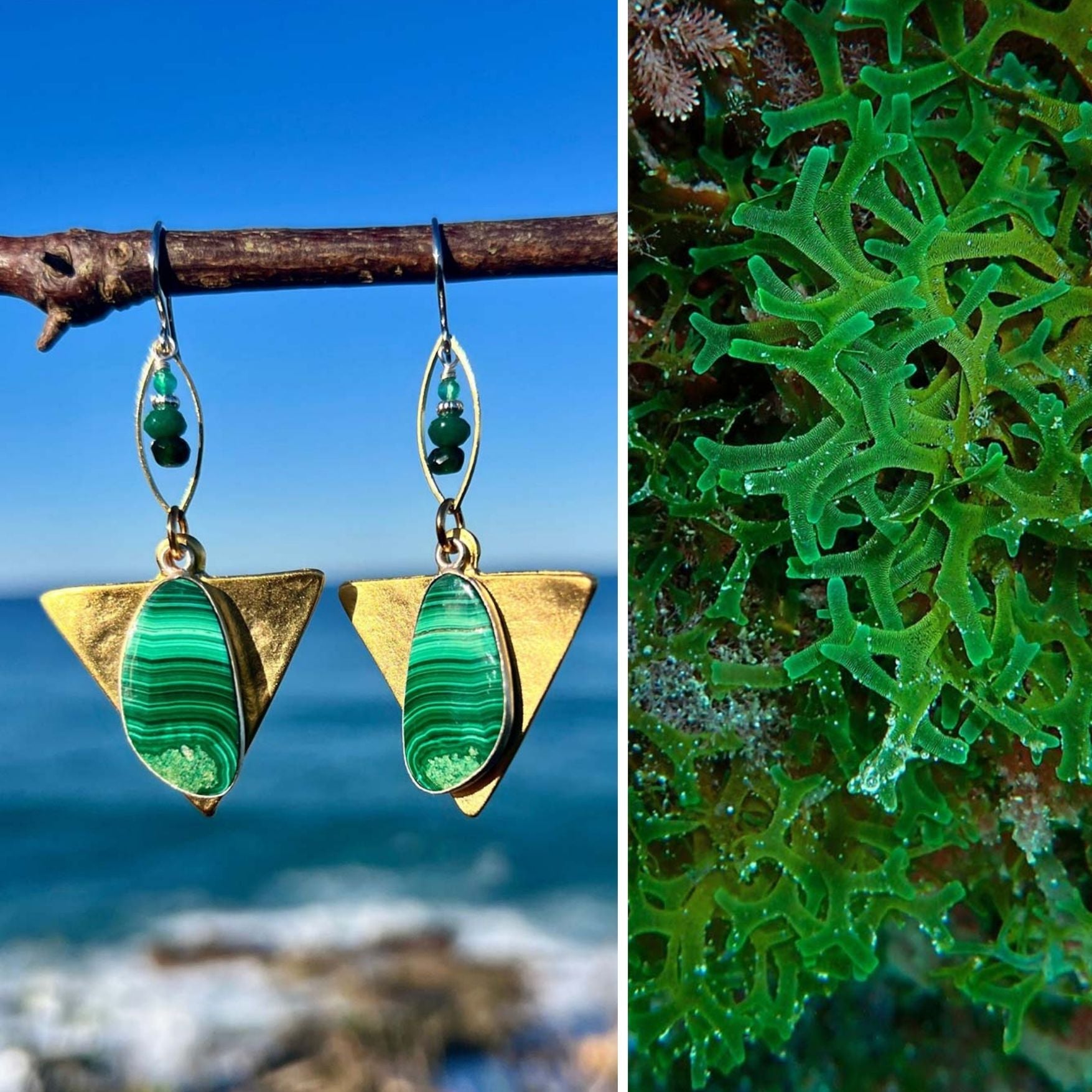 It reminded me of the rich striations in malachite, a stone long revered for its protective and transformative qualities. I paired it with green onyx and agate to reflect the layered mystery of those underwater gardens.
