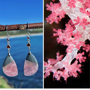 I wanted to capture that improbable mix of delicacy and strength. These 7cm earrings combine rose quartz and hematite in an Indian intarsia cut — the softest pink held by the steadiest grey, a contrast that makes both sing. Tiny rhodonite garnets add just a hint of pulse, a flicker of life.