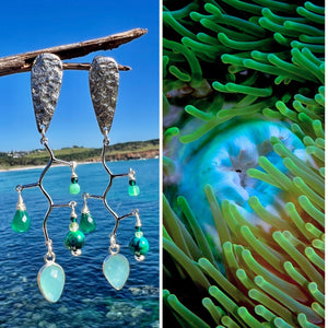 There’s a certain kind of blue-green that only the ocean can get away with — that impossible gradient between calm and chaos. I met it once in a particular stunning way inside a sea anemone off Komodo Island, and I’ve been trying to capture it ever since. These earrings are my attempt — part creature, part current, part chemistry.