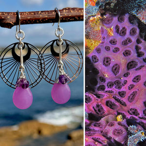 The muse for these 6 cm earrings was a colonial ascidian I found off La Pirate, near Flores — a riot of lilac and violet, so shockingly bright it looked like someone had dropped a paint bomb on the reef. Each tiny dot was a living inlet or outlet — ascidian architecture at its weirdest and most wonderful.