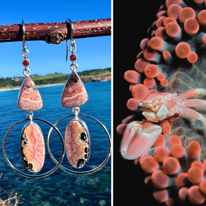 Back home, I turned that moment into these earrings: Rhodochrosite from the Andes — once believed by the Incas to be the solidified blood of kings and queens — reborn with the tiniest Indian Garnets in a kind of tropical rebellion. They are 7.2cm long and set into a 22k gold & silver-plated base from Jaipur & Seoul.