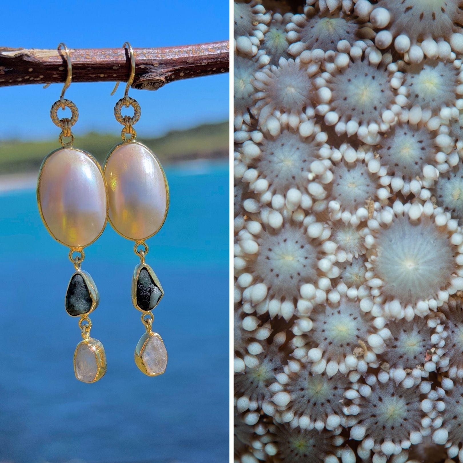 These earrings are a small study in structure and shimmer — inspired by the coral polypsI found while diving in the Coral Sea off Cairns, those tiny modular architects that together build entire underwater cities. Each polyp has its role, its rhythm, its luminous purpose — and that idea of collective elegance shaped this design.