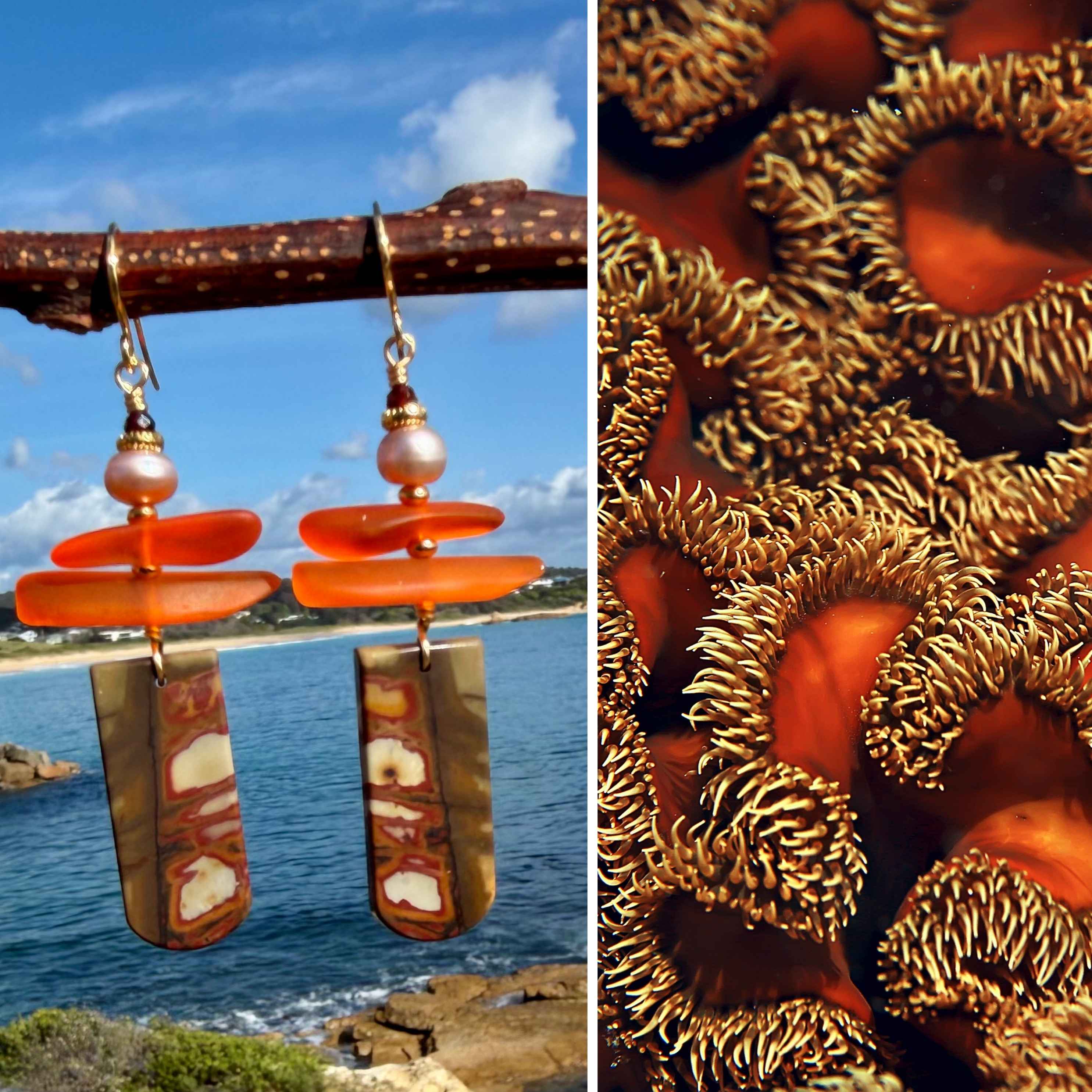 Each pair features slabs of Utah jasper—stones with unpredictable veins and organic chaos—paired with recycled orange glass shards, soft champagne pearls, and tiny garnets from India. The pieces are set in 20k gold-plated base from Seoul and Istanbul, giving the design a grounded yet luminous balance (6.9cm long).